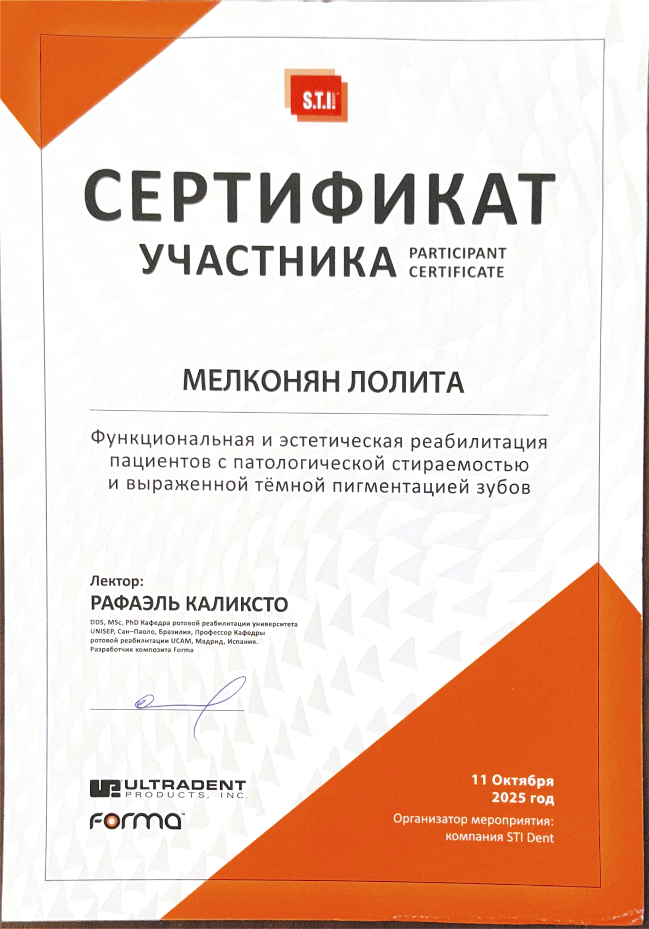 - 2025г - Функциональная и эстетическая реабилитация пациентов с патологической стираемостью и выраженной темной пигментацией зубов. Рафаэль Каликсто