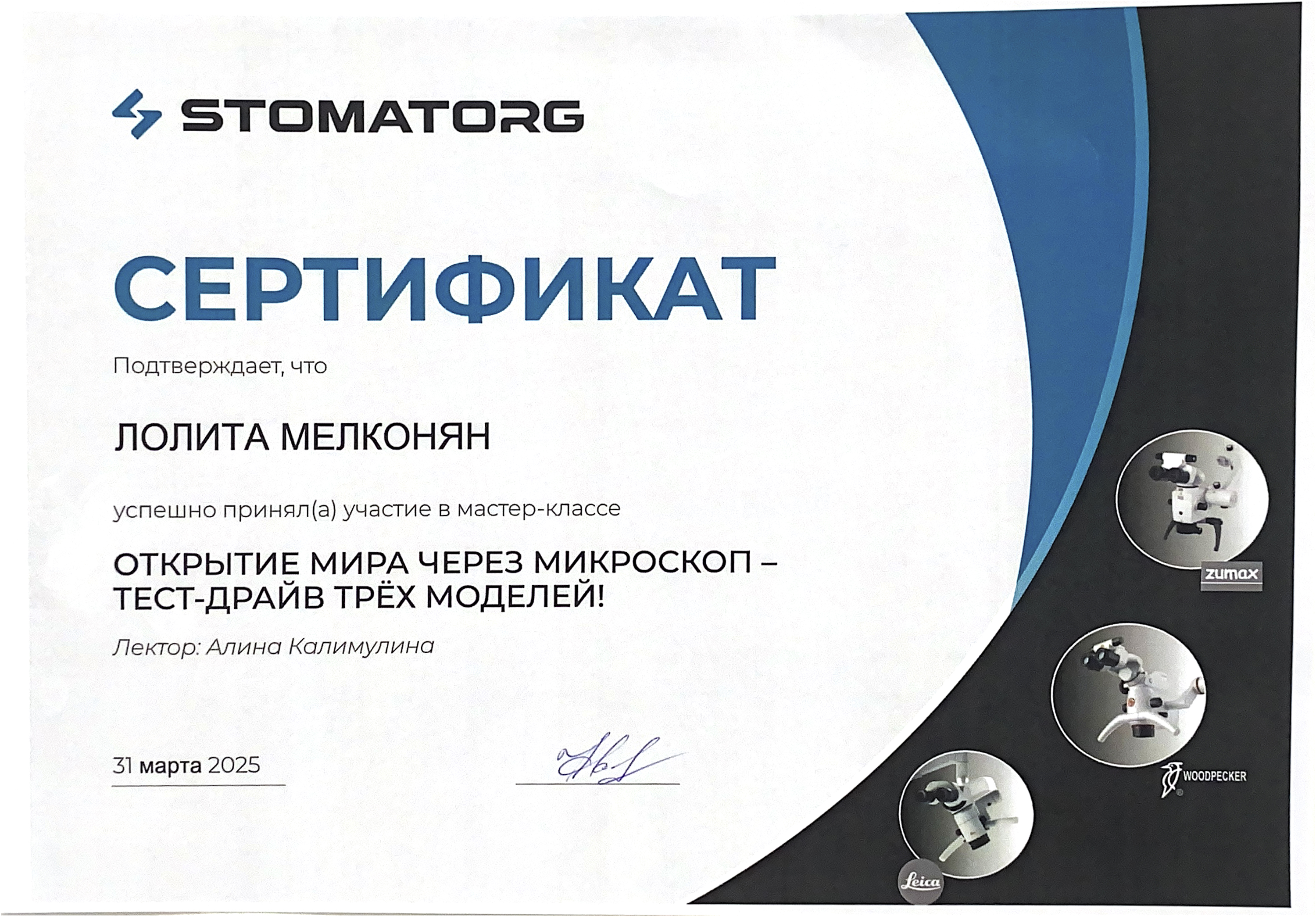 - 2025г – Свидетельство об аккредитации по специальности « Стоматология терапевтическая» КГМУ