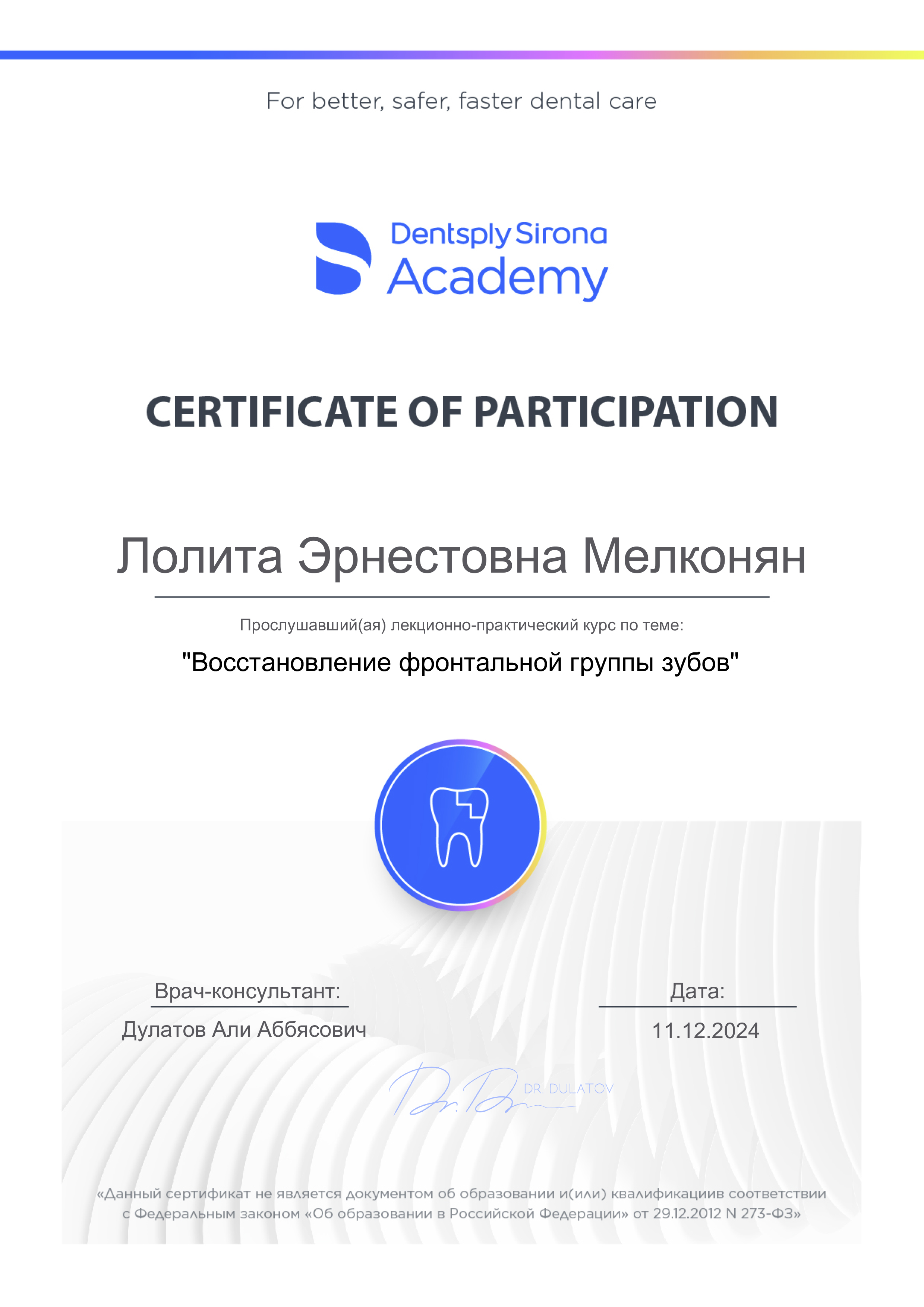 - 2024г -Реставрация фронтальной группы зубов Dentsply Sirona Academy. Дулатов Али Аббясович