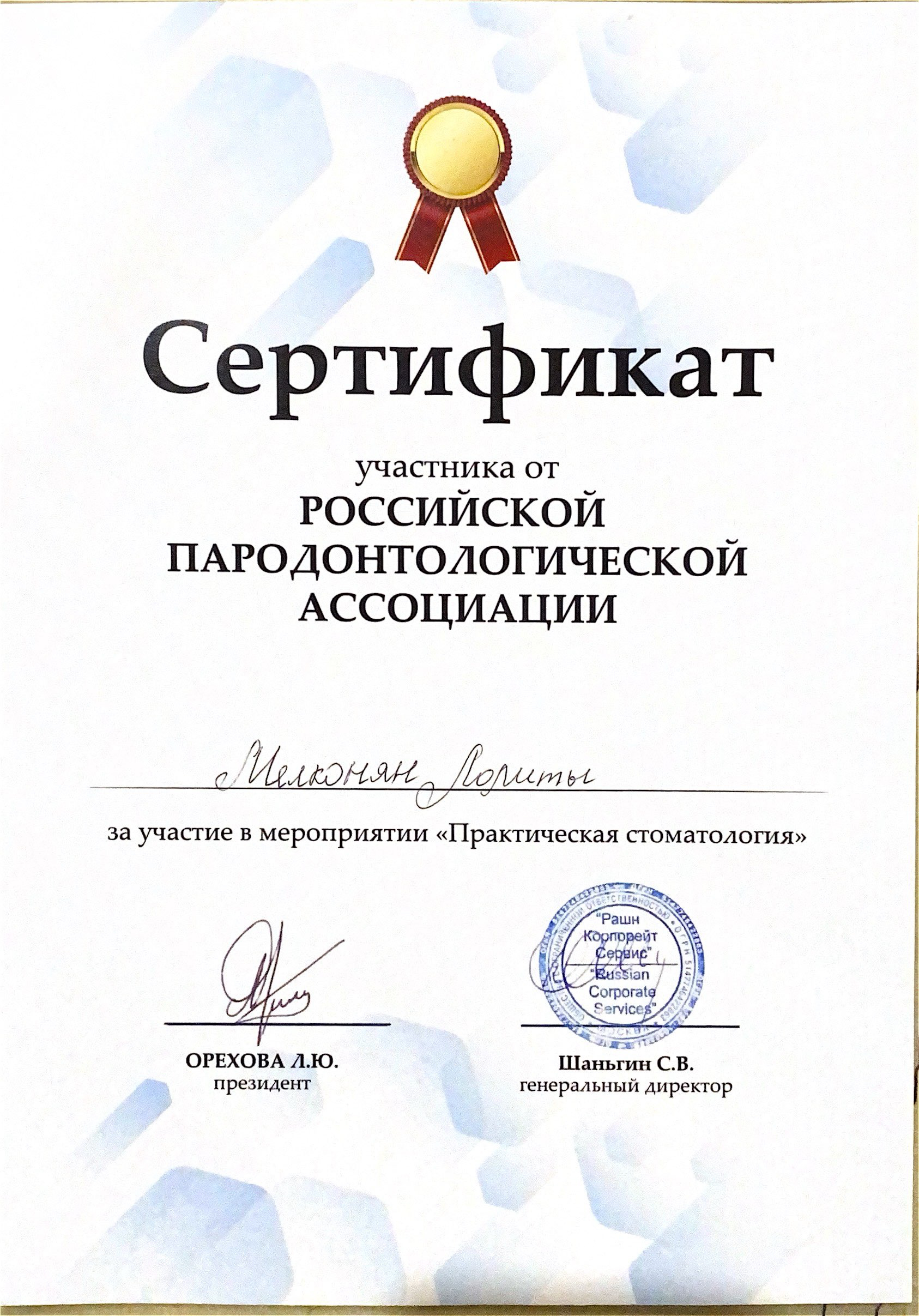 - 2024г – Свидетельство об аккредитации по специальности « Стоматология общей практики» БелГУ