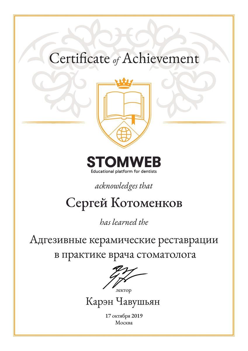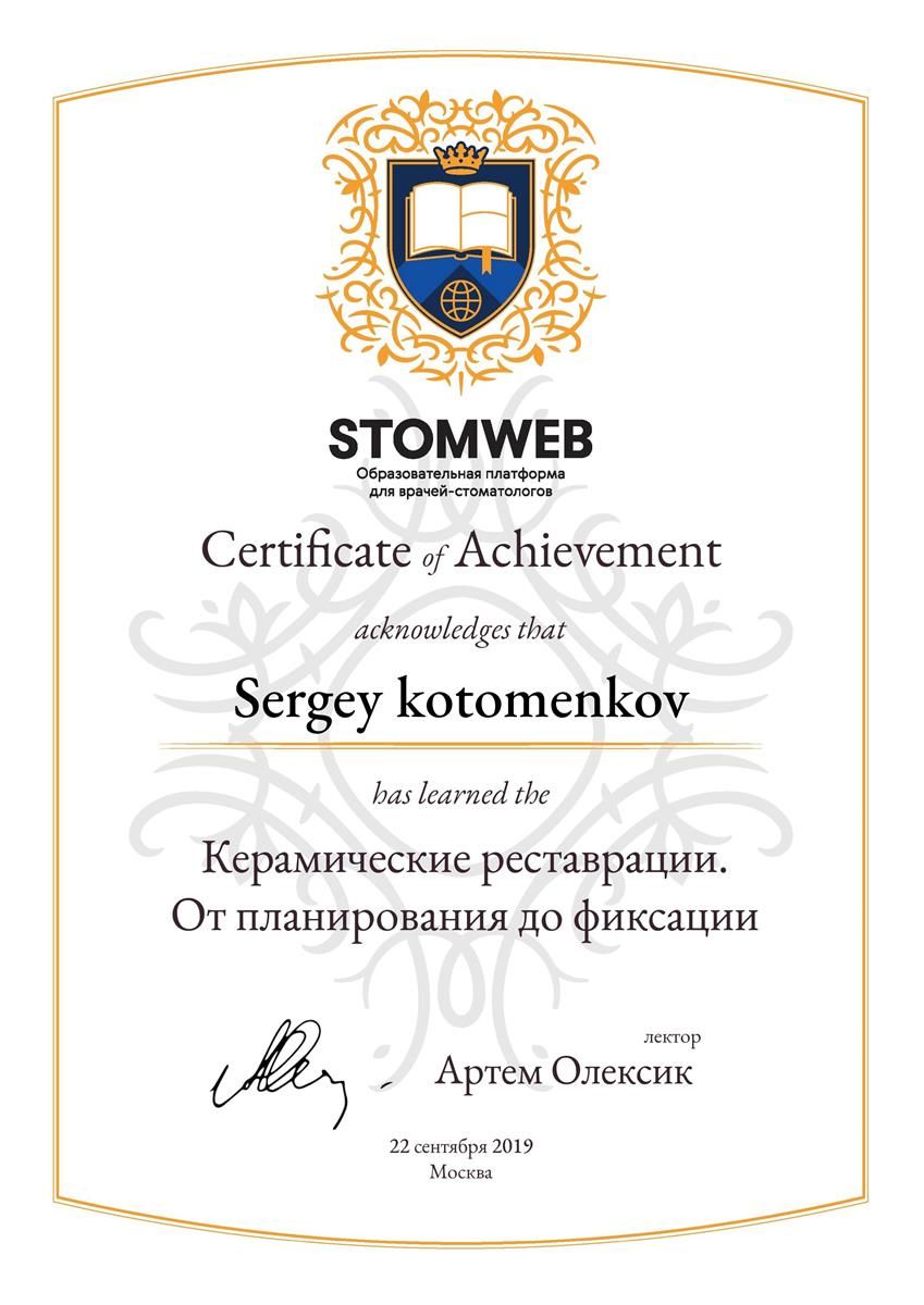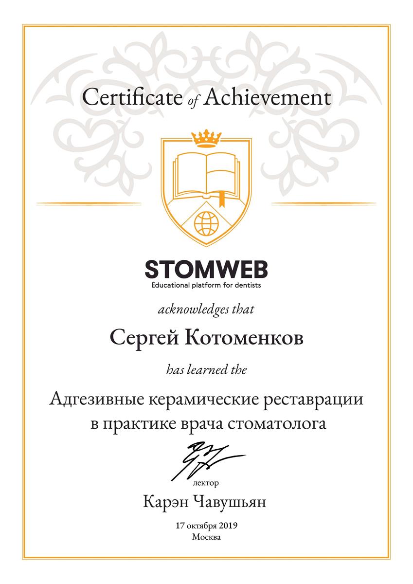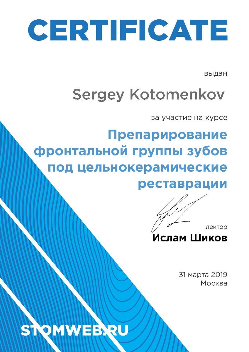 - Сертификат: "Стоматология ортопедическая" от 18.09.2021 в ФГБУ ДПО "ЦГМА"№7721023518683