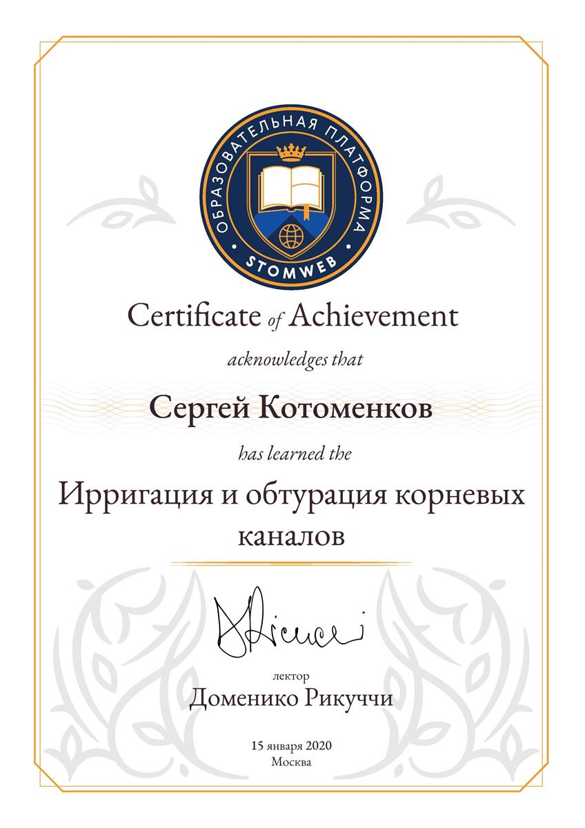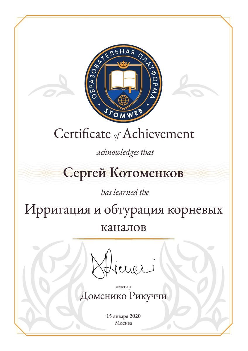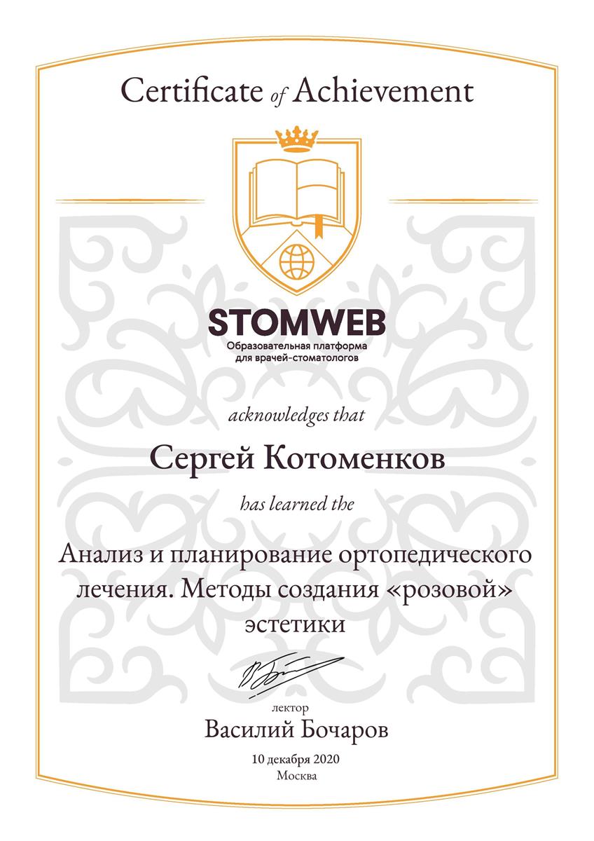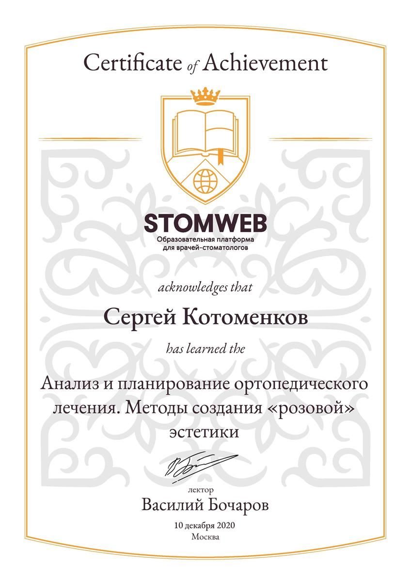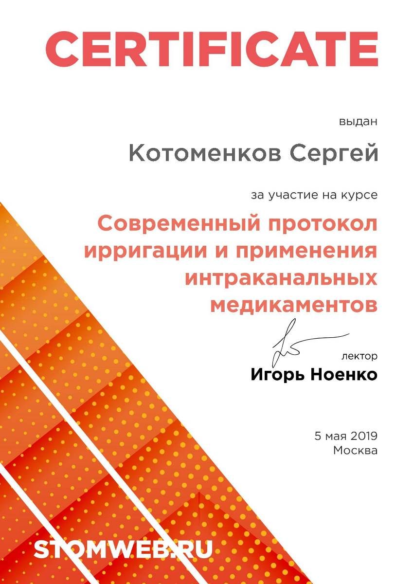 - Сертификат: "Стоматология ортопедическая" от 18.09.2021 в ФГБУ ДПО "ЦГМА"№7721023518683
