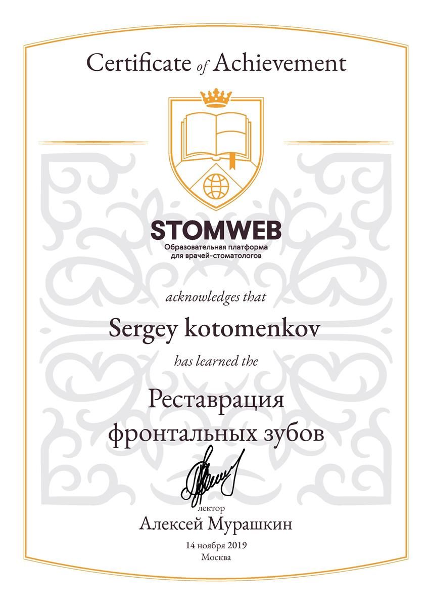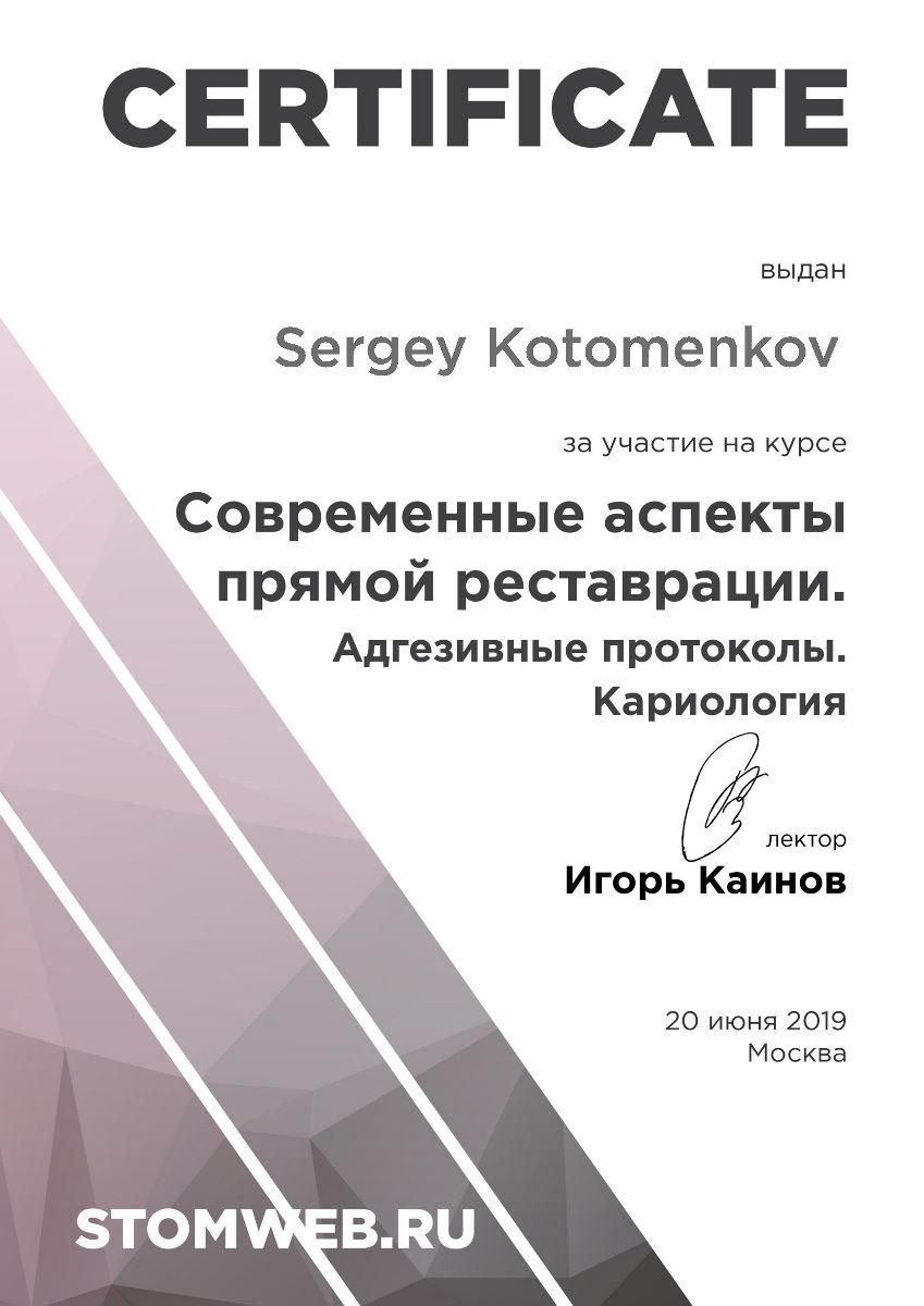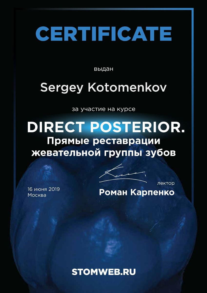 Хочу выразить огромную благодарность врачу Котоменкову Сергею и его помощнику за профессиональную реставрацию зуба, внимательное отношение и отличную работу!!!